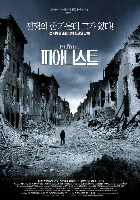 영화 피아니스트는 전쟁의 참혹함과 인간의 의지를 생각하게 해 준 영화다. 흔히들 인생 영화라고 부르는 이 영화는 나에게도 엄청난 충격과 감동을 준 작품이다. 나는 정말 좋아하는 사람들을 만나면 이 영화를 꼭 추천하곤 한다.